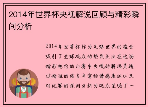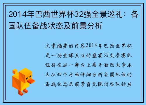 2014年巴西世界杯是一场精彩纷呈的足球盛宴,充满了激情、惊喜和突破性的时刻。本文将回顾并盘点这一届世界杯的赛程安排以及其中的精彩瞬间,从比赛进程、球员表现、技术数据分析以及重大赛事回顾等多个角度进行...